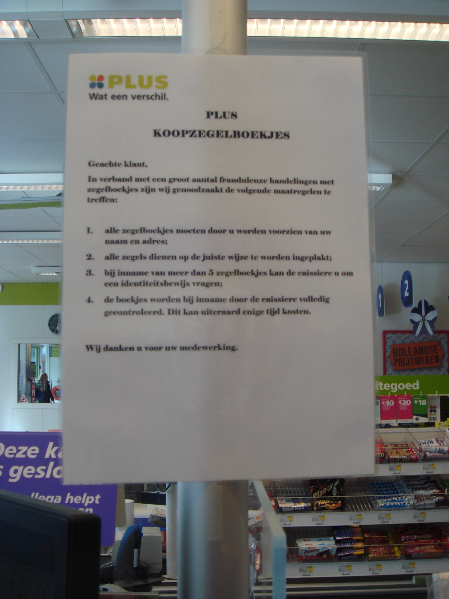 Dit waarschuwingsbordje hangt sinds kort bij een Super in Utrecht. Er wordt blijkbaar gefraudeerd met zegeltjes! Nu weten we dat cassières nog wel eens een rol mee naar huis nemen, maar toch niet dat klanten op massale schaal frauderen.