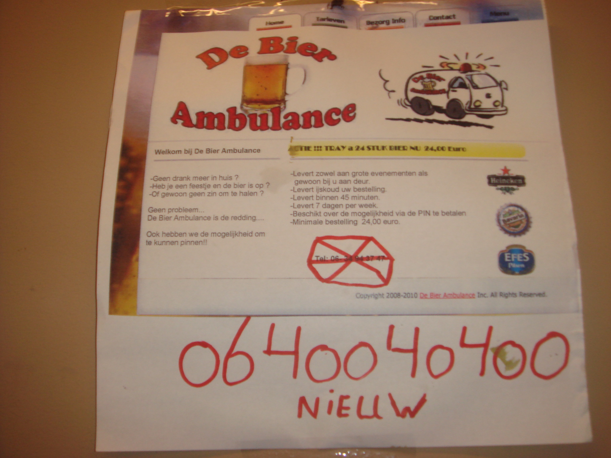 Het klinkt te mooi om waar te zijn, dus hebben we deze week de bierambulance uitgetest. De service was geweldig! Nog sneller dan een echte hulpdienst stond de dienstwagen voor de deur. Met een krat koud bier. Een echte aanrader voor de yuppen en studenten van Utrecht. Dus ben je boven de 16, dan mag volgend telefoonnummer niet missen in je mobiel: 06 400 40 400.